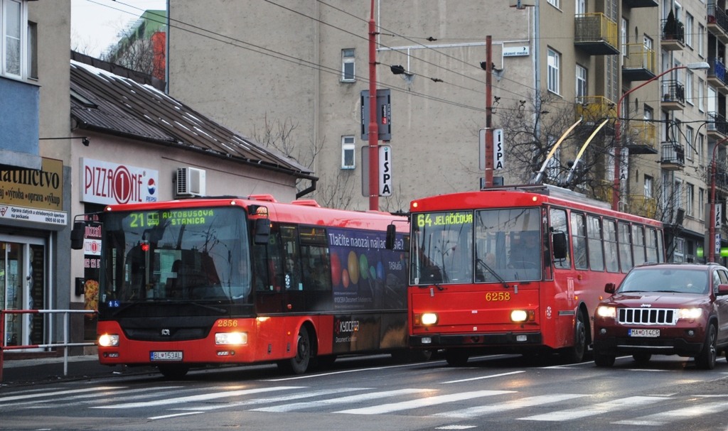 Fotografie SOR NB 18 City 2856 (BL-153AL) DP Bratislava | Škoda 14Tr10/6 6258 DP Bratislava | Bratislava-Staré Mesto, Šancová | evidencia-dopravcov.eu