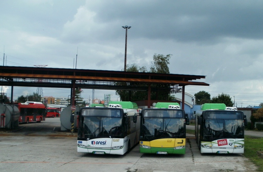Fotografie Solaris Urbino 15 III CNG 1207 (BA-947OL) DP Bratislava | Solaris Urbino 15 III CNG 1217 (BA-517OL) DP Bratislava | Solaris Urbino 15 III CNG 1220 (BA-520OL) DP Bratislava | Bratislava-Nové Mesto, Vozovňa Jurajov dvor | evidencia-dopravcov.eu
