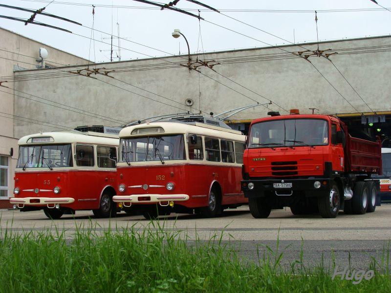 Fotografie Škoda 9TrHT28 53 DP Bratislava | Škoda 9TrH25 152 DP Bratislava | Tatra 815 S3 6x6 BA-579HU DP Bratislava | Bratislava-Staré Mesto, Vozovňa Hroboňova | evidencia-dopravcov.eu