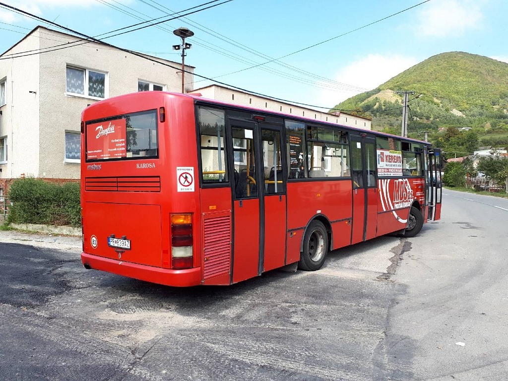 Karosa PB-839AZ prestávkuje v kopcovitej mestskej časti Podmanín. V pozadí je vrch Veľký Manín dosahujúci výšku 891 m. n. m.